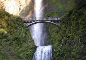 A. The bridge crosses the waterfall.